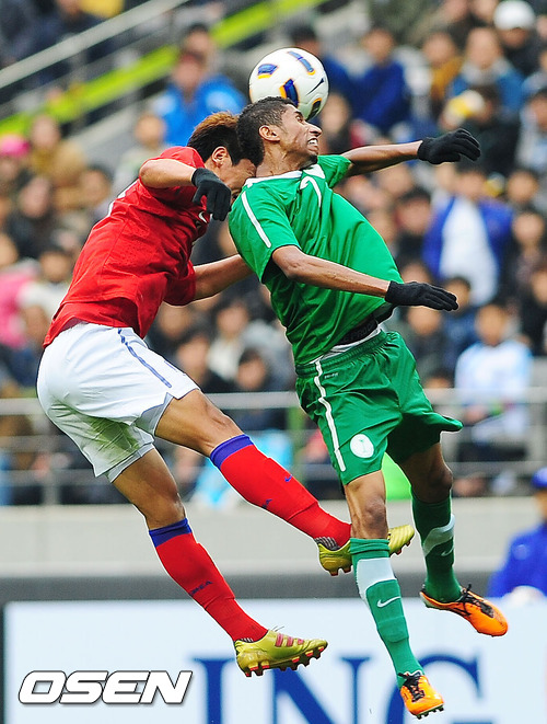 27일 오후 서울월드컵경기장에서 열린 ‘2012 올림픽 축구’ 아시아 최종예선 3차전 대한민국 대 사우디아라비아 경기에서 전반 한국 정우영이 공중볼다툼을 하고 있다.