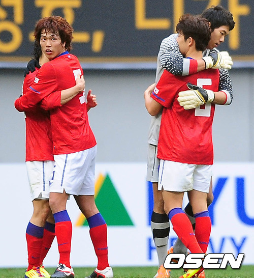 27일 오후 서울월드컵경기장에서 열린 '2012 올림픽 축구' 아시아 최종예선 3차전 대한민국 대 사우디아라비아 경기 종료 후 선수들이 기쁨의 포옹을 하고 있다.