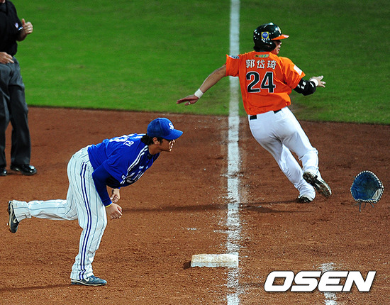 대만 타오위안에서 벌어진 대만과의 예선 마지막 경기 4회말 무사 1루 김상수의 송구가 너무 높아 타자주자가 2루까지 진루하고 있다.
