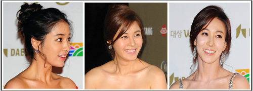 김하늘은 앞머리를 옆쪽 가르마로 자연스러운 S컬을 주어 우아하고 세련된 여신 미모를 뽐냈다. 김민정과 장영남은 웨이브 업스타일로 얼굴선을 따라 흐르는 자연스러운 잔머리가 포인트. 로맨틱한 분위기를 연출해 그들의 사랑스러운 외모를 더욱 돋보이게 했다.
