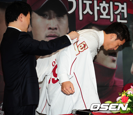 29일 오전 서울 목동구장에서 열린 넥센 히어로즈의 이택근 환영식 및 기자회견에서 이장석 대표와 이택근에게 유니폼을 입히고 있다.