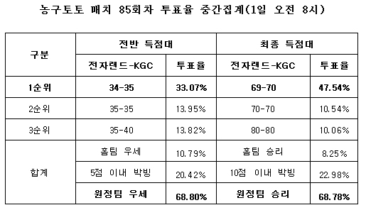 2011-2012시즌 농구토토 매치 85회차 투표율 중간집계 결과