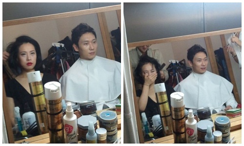 사진 속 이승윤과 이희경은 화보를 위해 함께 메이크업을 받는 중으로, 첫 번째 사진에서 두 사람은 무표정으로 앞을 보고 앉아있는 반면 두 번째 사진에 이희경은 쑥스러운 듯 손으로 입을 가리고 웃는 모습이다.