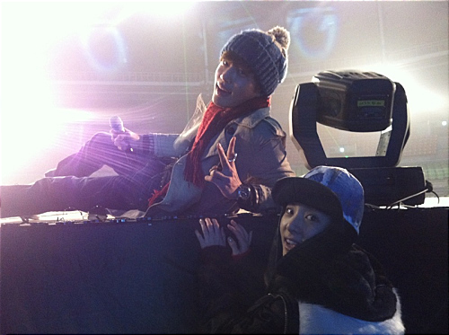 사진 속 산다라박은 무대 아래에서 귀여운 모자를 쓴 채 카메라를 바라보고 있다. 무대 위에 올라가있는 세븐은 손으로 브이(V)자를 그리며 사진을 찍고 있다.