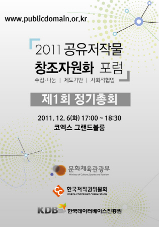 오는 6일 문화체육관광부(장관 최광식)가 주최하고 한국저작권위원회(위원장 유병한)와 한국데이터베이스진흥원(원장 한응수)이 주관한 가운데 코엑스 그랜드볼룸에서 ‘공유저작물 창조자원화 포럼’의 정기총회가 진행된다.