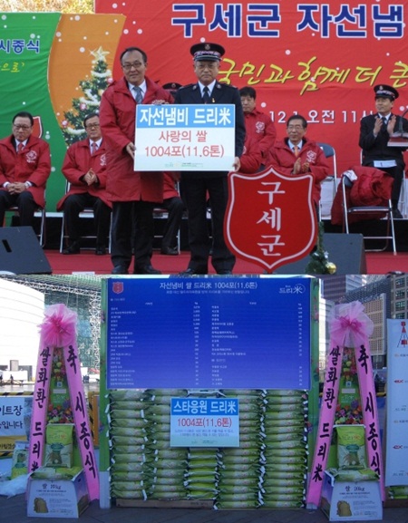 12월 1일 서울광장 자선냄비 시종식에서 스타응원 드리미 쌀화환 11.6톤이 자선냄비에 전달됐다. /구세준, 드리미 제공.