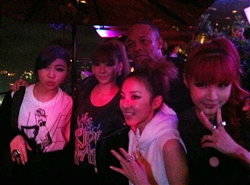 사진 속 2NE1은 닥터 드레와 다정하게 사진을 찍고 있다. 환하게 카메라를 향해 웃고 있는 멤버들과 흐뭇한 미소를 짓고 있는 닥터 드레의 모습이 인상적이다.