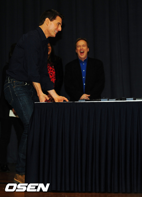 2일 오후 서울 용산구 그랜드 하얏트 호텔 그랜드 볼룸에서 열린 영화 '미션 임파서블:고스트 프로토콜(이하 미션 임파서블 4)' 톰 크루즈 공식 내한 기자회견에서 톰 크루즈가 직접 테이블을 옮기고 있다.