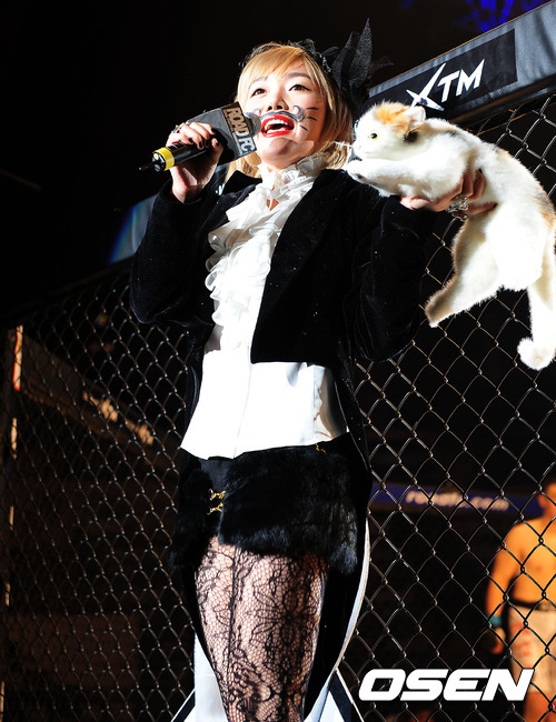 3일 오후 서울 장충체육관에서 열린 프로 종합격투기 '로드FC 005 나이트 오브 챔피언스' 경기에 낸시랭이 경기 라운드 걸로 무대에 오른 후 말을 하고 있다.