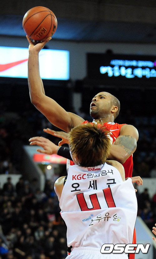 4일 오후 잠실 학생체육관서 열린 '2011-2012 KB국민카드 프로농구' 서울 SK와 안양 인삼공사의 경기 2쿼터 SK 존슨이 골밑슛을 하고 있다.