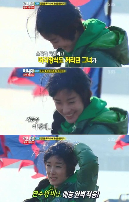 4일 오후 방송된 SBS '일요일이 좋다-런닝맨(이하 런닝맨)'에서 게스트로 출연한 오연수는 유재석-개리와 한팀으로 게임에 나섰다.