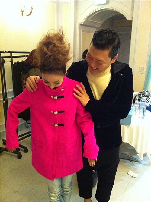 사진 속에는 핑크색의 코트를 귀엽게 차려 입은 산다라박과 그의 어깨에 손을 올린 채 흐뭇한 미소를 보이는 싸이가 있다.