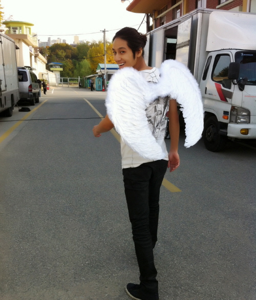 이는 지난 5일 첫 방송된 JTBC 월화드라마 '빠담빠담-그와 그녀의 심장박동소리(극본 노희경,연출 김규태)'을 통해 4차원 천사 '이국수'로 변신한 김범이 장난기 가득한 표정으로 장난감 날개를 달고 천사로 변신한 비하인드 사진인 것.