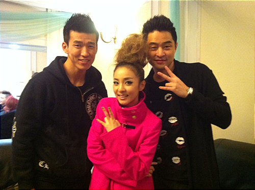 그룹 2NE1의 멤버 산다라박이 선배 힙합 듀오 지누션과 함께 사진을 찍어 공개했다.