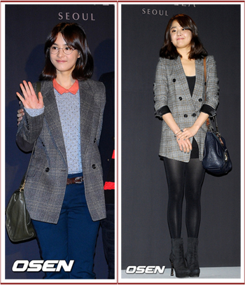 반면 배우 김정화는 블루 니트에 오렌지 스커트, 땡땡이 스타킹까지 다소 과한 느낌을 줘서 살짝 아쉬움이 남는 코디다. 하지만 부해 보일 수 있는 니트에 벨트를 착용해 줌으로써 한결 날씬해 보이는 센스는 잊지 않았다.