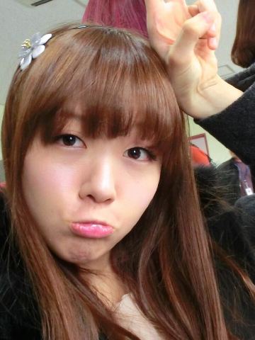 사진 속 민아는 입술을 쭉 내민 울상 표정을 짓고 카메라를 응시하고 있다. 표정과는 반대로 브이를 그린 손은 머리를 향하고 있다.