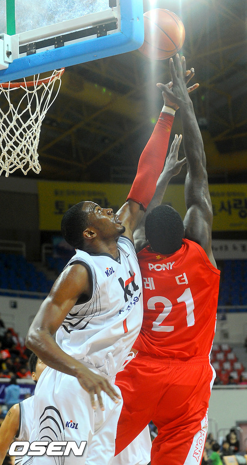 6일 오후 울산 동천체육관에서 열린 '2011-2012 KB국민카드 프로농구' 울산 모비스와 부산 KT의 경기 1쿼터 KT 로드가 모비스 레더의 슛을 슛블록을 하고 있다.
