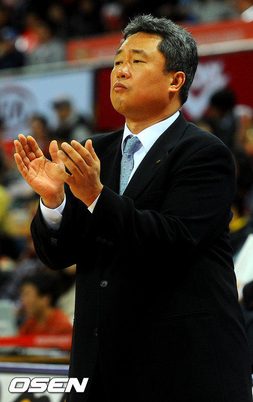 6일 오후 울산 동천체육관에서 열린 '2011-2012 KB국민카드 프로농구' 울산 모비스와 부산 KT의 경기 2쿼터 종료 후 KT 전창진 감독이 박수를 치며 선수들을 격려하고 있다.