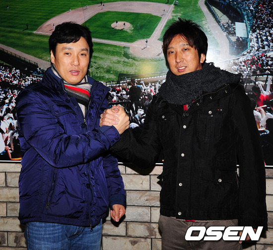 한국과 일본을 대표하는 야구 영웅이 맞붙는다. 이승엽(35, 삼성 내야수)과 후지카와 규지(31, 한신 투수)가 7일 오후 서울 잠실구장에서 일본 언론이 주최하는 간사이 TV대담에서 입심대결을 펼친다. 잠실 구장 입구에서 이승엽과 후지카와 규지가 포토타임을 갖고 있다.
