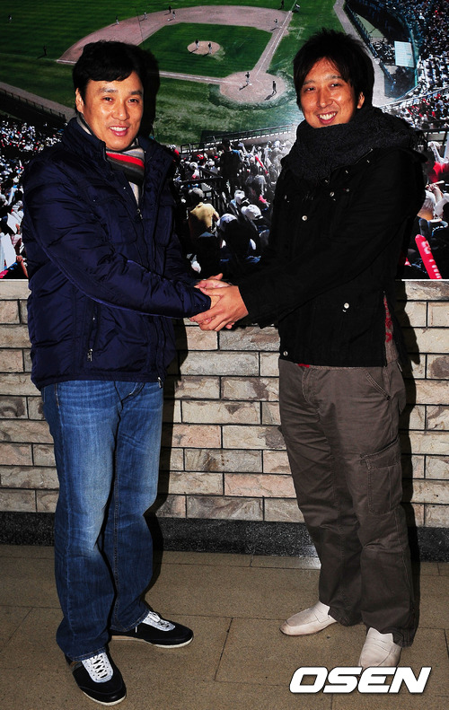 한국과 일본을 대표하는 야구 영웅이 맞붙는다. 이승엽(35, 삼성 내야수)과 후지카와 규지(31, 한신 투수)가 7일 오후 서울 잠실구장에서 일본 언론이 주최하는 간사이 TV대담에서 입심대결을 펼친다. 잠실 구장 입구에서 이승엽과 후지카와 규지가 포토타임을 갖고 있다.