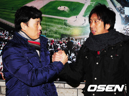 한국과 일본을 대표하는 야구 영웅이 맞붙는다. 이승엽(35, 삼성 내야수)과 후지카와 규지(31, 한신 투수)가 7일 오후 서울 잠실구장에서 일본 언론이 주최하는 간사이 TV대담에서 입심대결을 펼친다. 잠실 구장 입구에서 이승엽과 후지카와 규지가 포토타임을 갖고 있다.