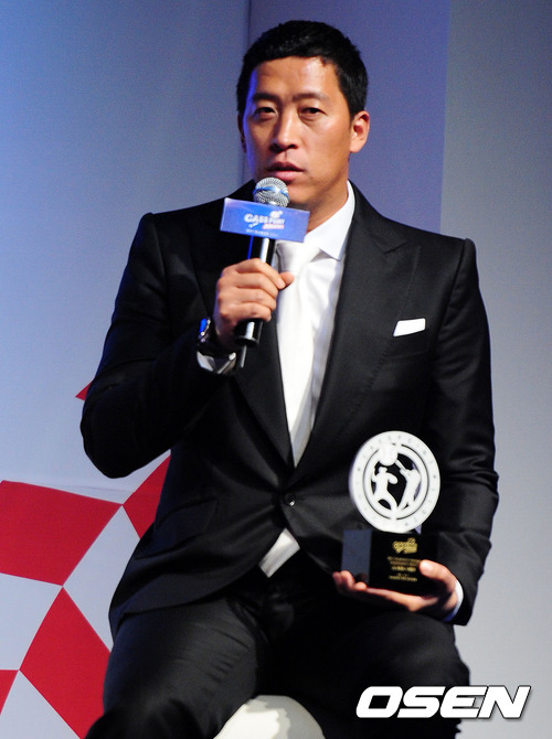 카스 모멘트를 수상한 LG 이병규가 무대에 올라 인사를 하고 있다.