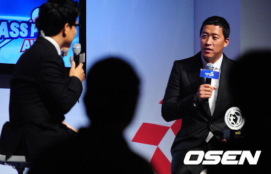 카스 모멘트를 수상한 LG 이병규가 무대에 올라 인사를 하고 있다.