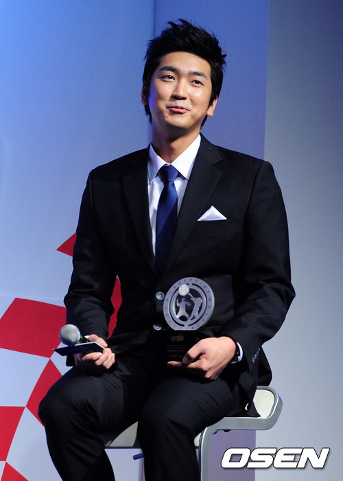카스 모멘트를 수상한 넥센 심수창이 무대에 올라 인사를 하고 있다.