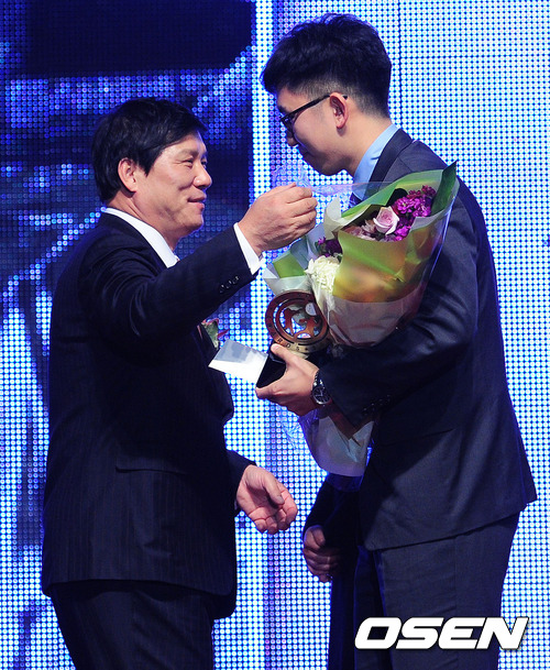 레전드 시상 수상에 故 장효조 선수의 아들 장의태씨가 허구연 위원으로부터 꽃다발을 건네받고 있다.