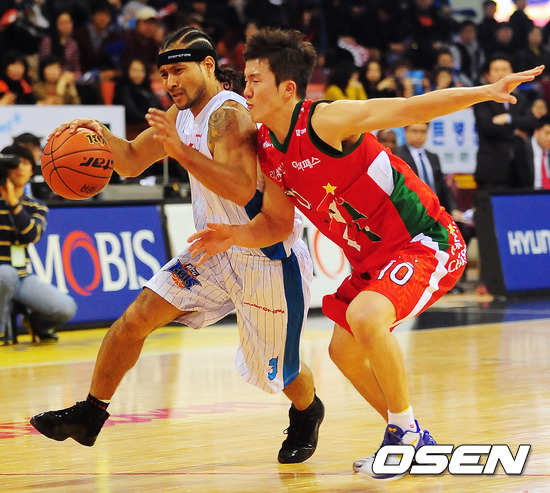 7일 오후 안양실내체육관에서 열린 '2011~2012 KB국민카드 프로농구' 안양 KGC와 전주 KCC의 경기에서 1쿼터 KCC 전태풍이 KGC 박찬희를 돌파하려 하고 있다.