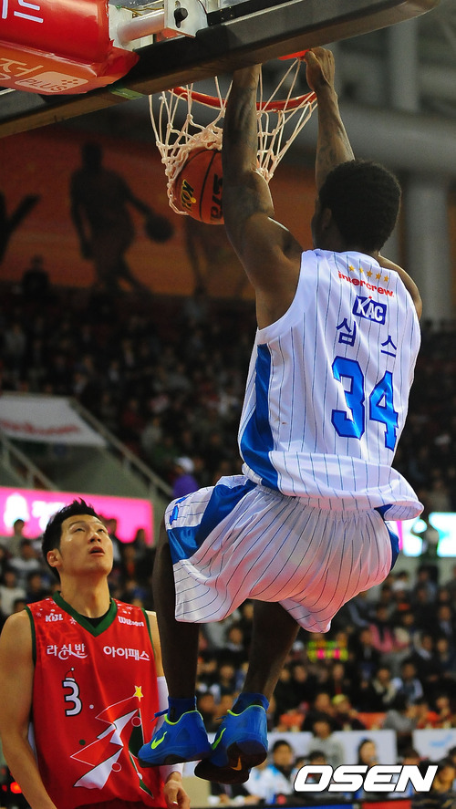 7일 오후 안양실내체육관에서 열린 '2011~2012 KB국민카드 프로농구' 안양 KGC와 전주 KCC의 경기에서 2쿼터 KCC 심스가 투핸드 덩크슛을 내리 꽂고 있다.