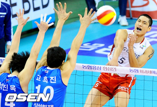 7일 오후 경북 구미 박정희체육관서 열린 '2011-2012 NH농협 프로배구 V리그' LIG손해보험과 삼성화재의 경기 2세트 LIG 김요한이 강타를 날리고 있다