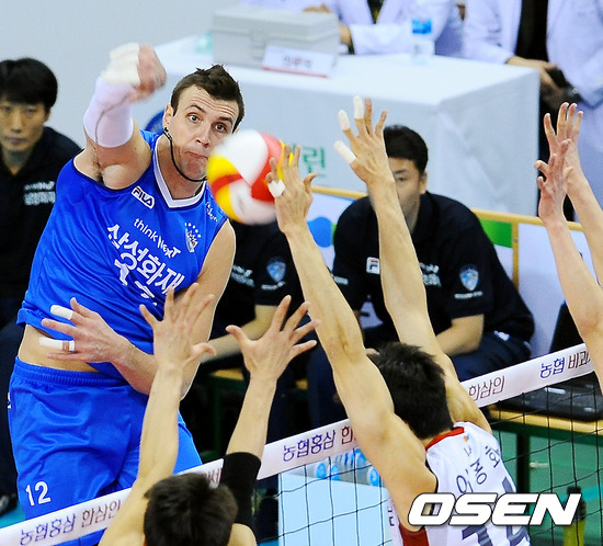 7일 오후 경북 구미 박정희체육관서 열린 '2011-2012 NH농협 프로배구 V리그' LIG손해보험과 삼성화재의 경기 1세트 삼성화재 가빈이 강타를 날리고 있다.