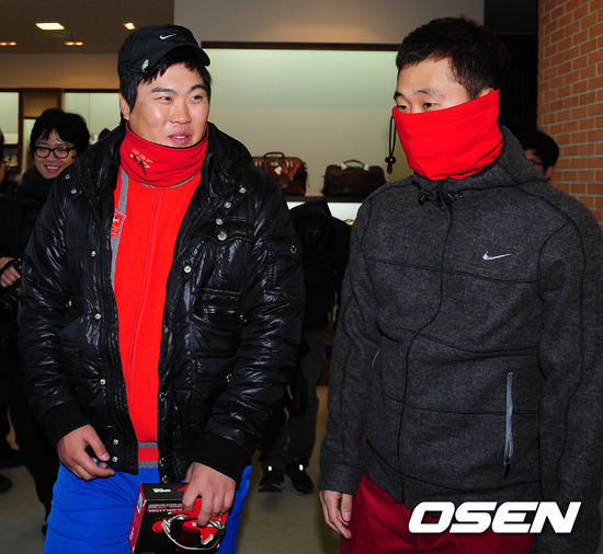 경기에 앞서 한화 류현진과 KIA 윤석민이 이야기를 나누고 있다.
