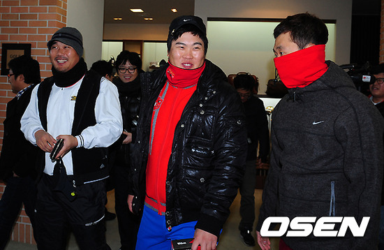 대회에 앞서 SK 이호준, 한화 류현진과 KIA 윤석민이 이야기를 나누고 있다.