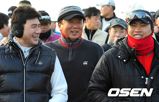 KIA 선동열 감독이 서재응, 한화 류현진과 이야기를 나누고 있다.