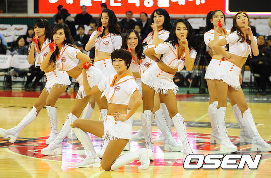 8일 오후 서울 잠실학생체육관에서 열린 '2011~2012 KB국민카드 프로농구' 서울 SK와 원주 동부 경기에서 SK 치어리더들이 코트 위에서 화려한 공연을 펼치고 있다.