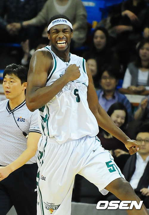 8일 오후 서울 잠실학생체육관에서 열린 '2011~2012 KB국민카드 프로농구' 서울 SK와 원주 동부 경기에서 4쿼터 동부 벤슨이 SK 김민수에게 반칙을 당해 보너스 원샷을 얻어내며 투핸드 덩크에 성공한 후 고릴라 세레머니를 하고 있다.