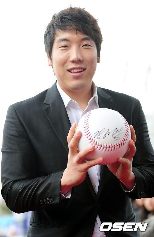 11일 오후 서울 강남구 2011 SETEC 제1전시장(서울무역전시컨벤션센터)에서 열린 롯데카드 프로야구 골든글러브 시상식 레드카펫에서 김현수가 사인볼을 들고 포즈를 취하고 있다.