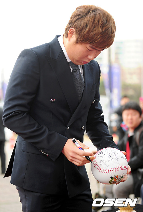 11일 오후 서울 강남구 2011 SETEC 제1전시장(서울무역전시컨벤션센터)에서 열린 롯데카드 프로야구 골든글러브 시상식 레드카펫에서 두산 양의지가 사인볼에 사인을 하고 있다