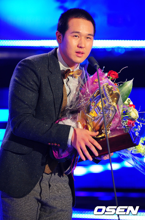 최정은 11일 오후 서울 강남구 대치동 2011 SETEC 제1전시장(서울무역전시컨벤션센터)에서 열린 롯데카드 프로야구 골든글러브 시상식에서 박석민(삼성), 황재균(롯데), 정성훈(LG)을 제치고 3루수 부문 골든 글러브를 품에 안았다.