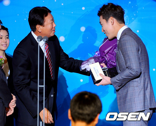 12일 오전 서울 소공동 롯데호텔에서 진행된 '2011동아스포츠대상' 시상식에서 윤석민이 프로야구 올해의 선수상을 수상하고 선동렬 감독의 축하를 받고 있다.