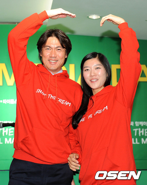 홍명보 올림픽대표팀감독과 대교 심서연이 포토타임을 갖고 있다.