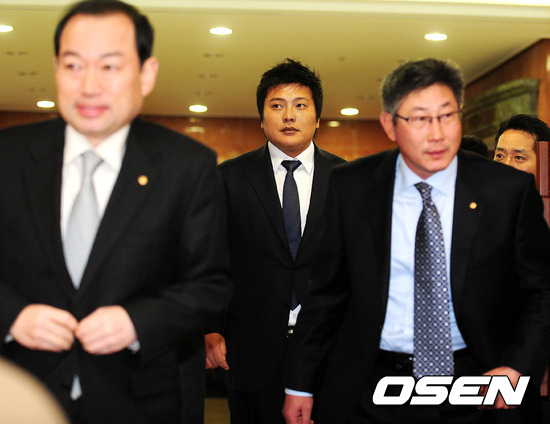 12일 오후 대전 리베라 호텔에서 열린 김태균(29, 한화 이글스)입단 기자회견에서 김태균과 정승진 대표, 한대화 감독이 식장으로 입장 하고 있다.
