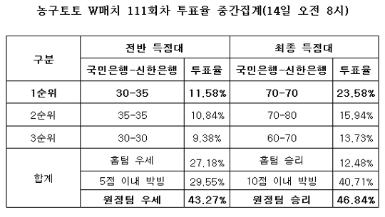 2011-2012시즌 농구토토 W매치 111회차 투표율 중간집계 결과