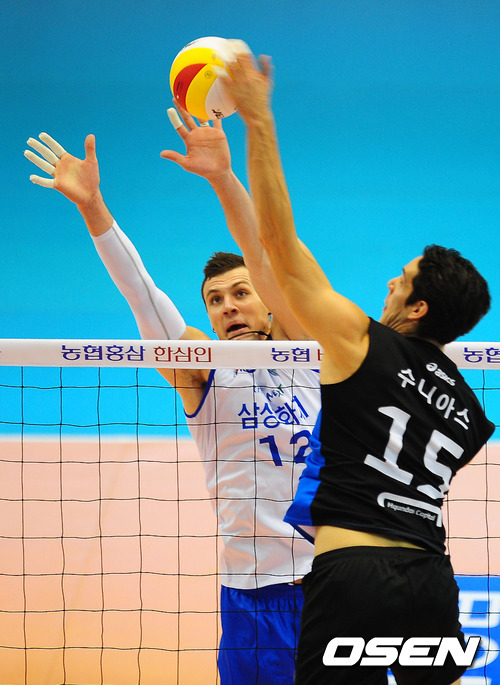 14일 오후 대전시 중구 충무체육관에서 열린 'NH농협 2011-2012 V리그' 삼성화재와 현대캐피탈의 경기에서 현대캐피탈 수니아스가 공격할때 삼성화재 가빈이 블로킹을 하고 있다.