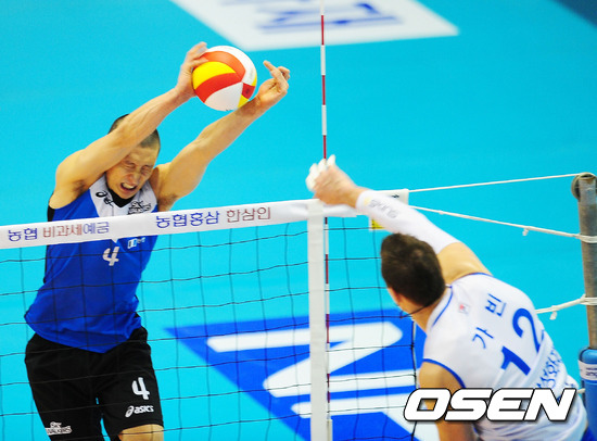 14일 오후 대전시 중구 충무체육관에서 열린 'NH농협 2011-2012 V리그' 삼성화재와 현대캐피탈의 경기에서 삼성화재 가빈의 강타를 현대캐피탈 문성민이 막아내고 있다.