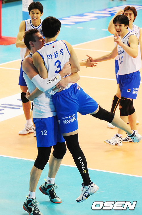 5세트 삼성화재 가빈이 박철우를 껴안아 올리고 있다./ rumi@osen.co.kr