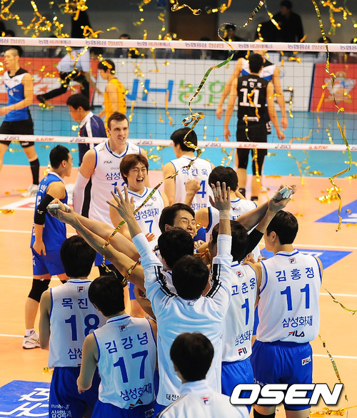 경기를 마치고 삼성화재 선수들이 코트 위에서 기쁨을 나누고 있다. / rumi@osen.co.kr