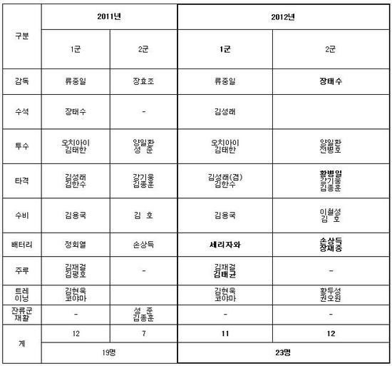 내년 시즌에는 지난해보다 4명 늘어난 총 23명(감독포함)의 코칭스태프가 선수들을 지도한다. 이번 개편의 핵심은 2군 코칭스태프를 보강해 젊은 유망주를 키워내는 데 주안점을 뒀다.